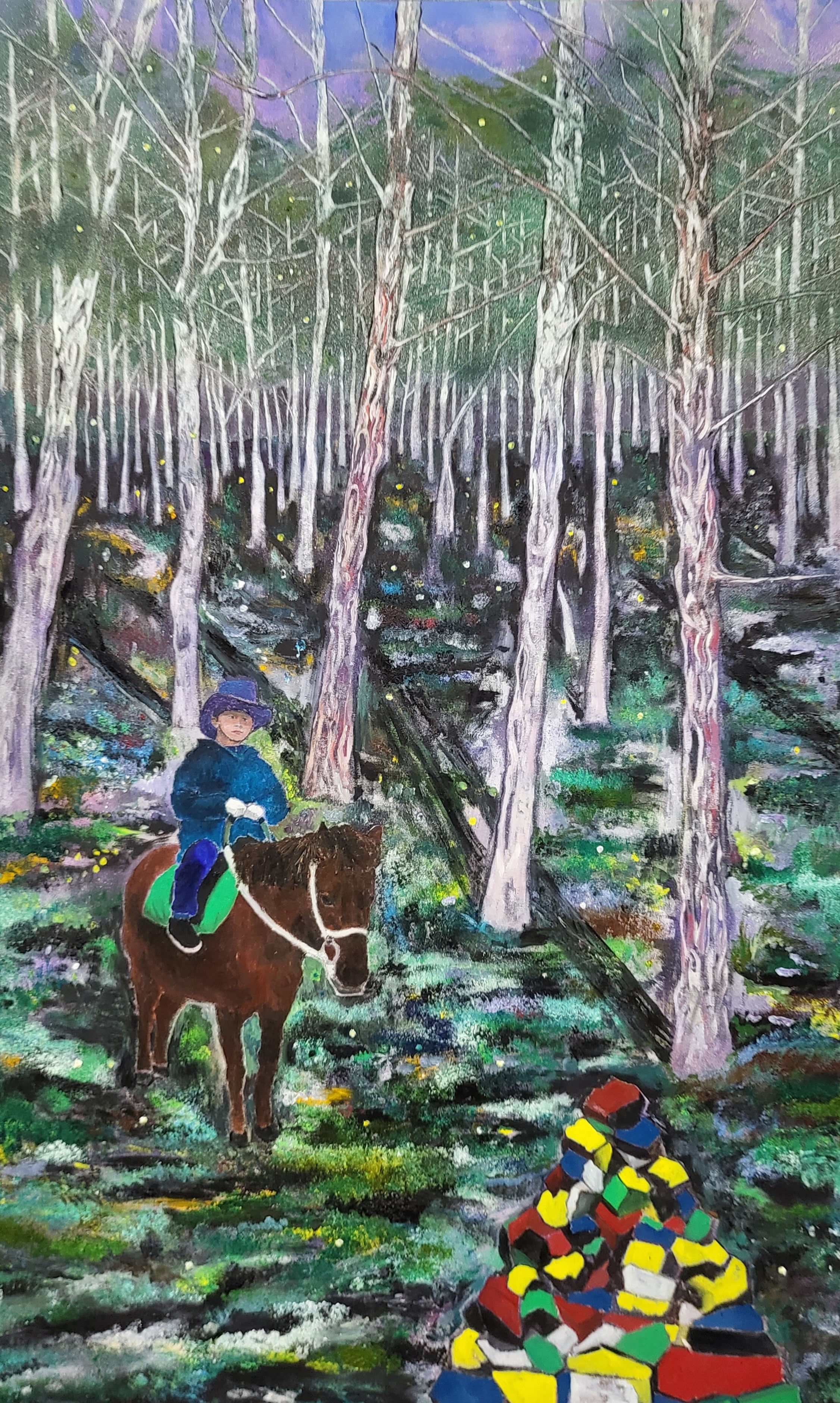 The stones (2023) resonated the most with Lee. Representing a happy moment in the past, Lee had responded to the memory in a state of anxiety and melancholia. Despite the bright rocks at the corner of the canvas, Lee captured his worries through the tall trees, painting long shadows that cast a looming presence over the landscape. The brushwork of the shadows were also rough and jagged, dragging across the canvas to highlight a sense of underlying tension.