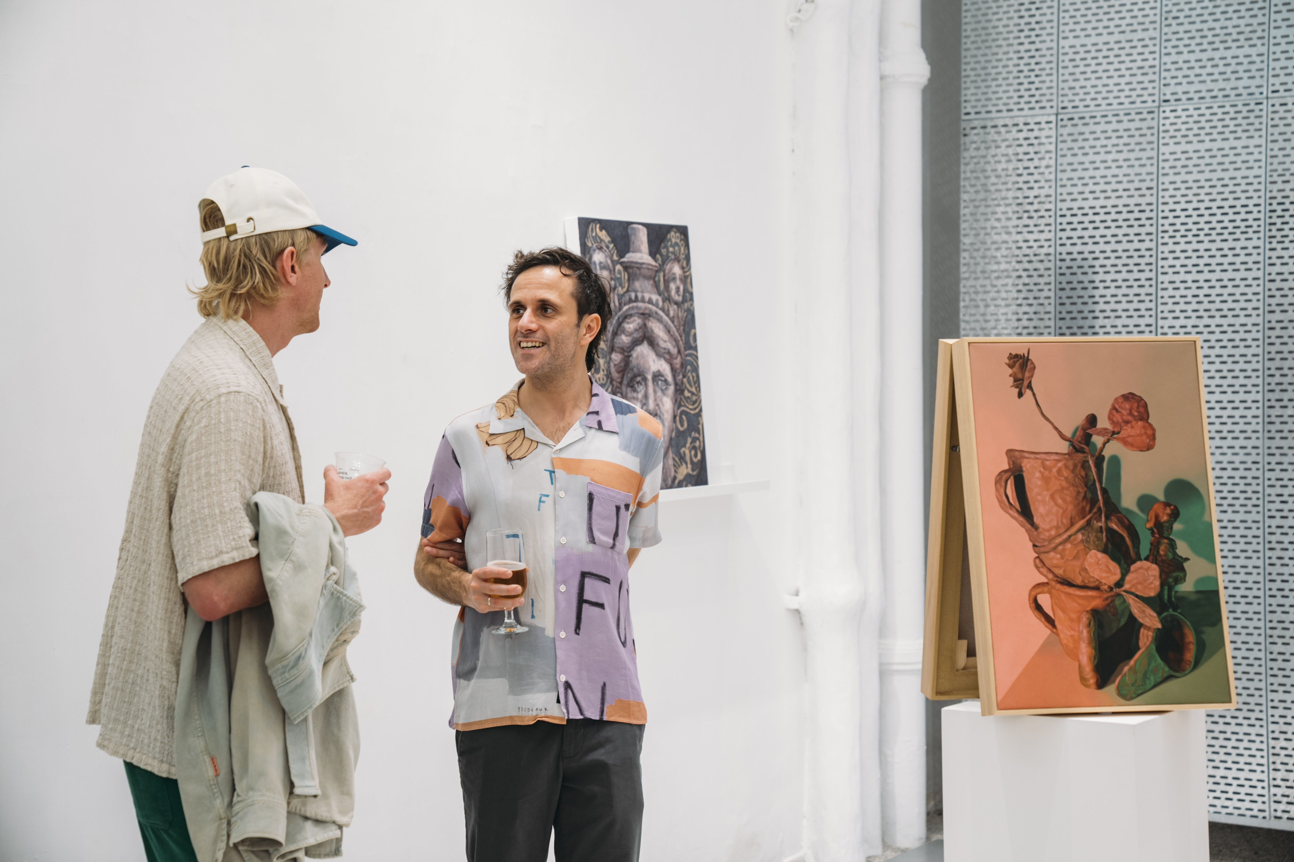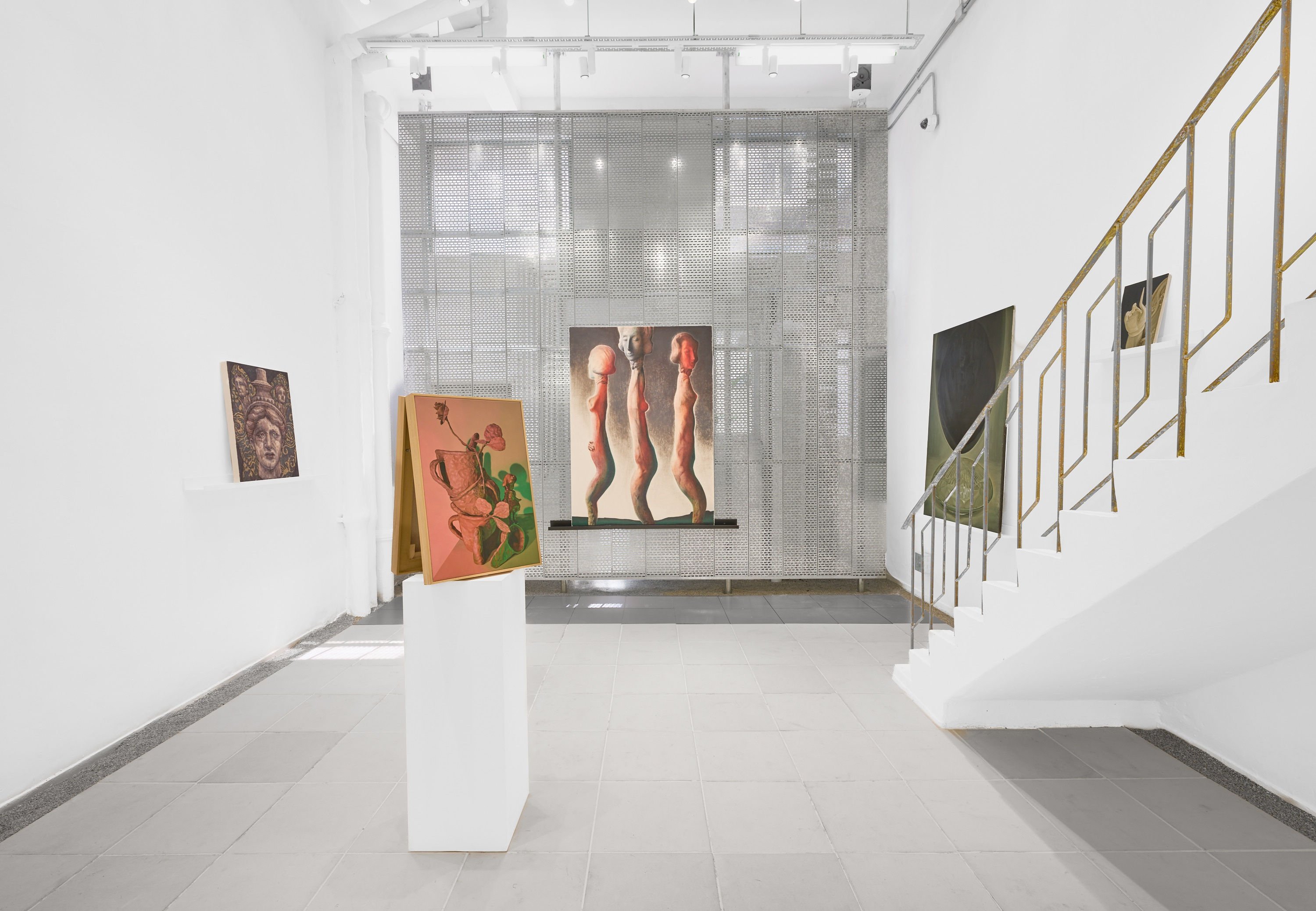 In order to highlight the concept of the exhibition, Bogojev emphasised the weight and volume of the depicted motifs by presenting the paintings the way one would display sculptures. Placed on plinths or shelves, he transforms paintings into something that needs a "ground base" rather than simply hanging them on a wall. "Also, it allows the viewer to peek at the back of the paintings, which isn't something that is often possible," added Bogojev, "And which adds to how the work appears and feels as a whole." With its unique placement, visitors who enter the gallery can experience how the artworks are positioned throughout the space. Presenting a diffusion of colors and objects, there is a form of dynamic interaction between each work - the picture-perfect quality of Quinten Ingelaere's still-life-like objects are framed by the domestic clay items in Wedhar Riyadi's paintings near the back, and Filip Mirazovic's porcelain figures offer a sharp contrast to the bold red and exaggerated curves of Ken Nurenberg's work.