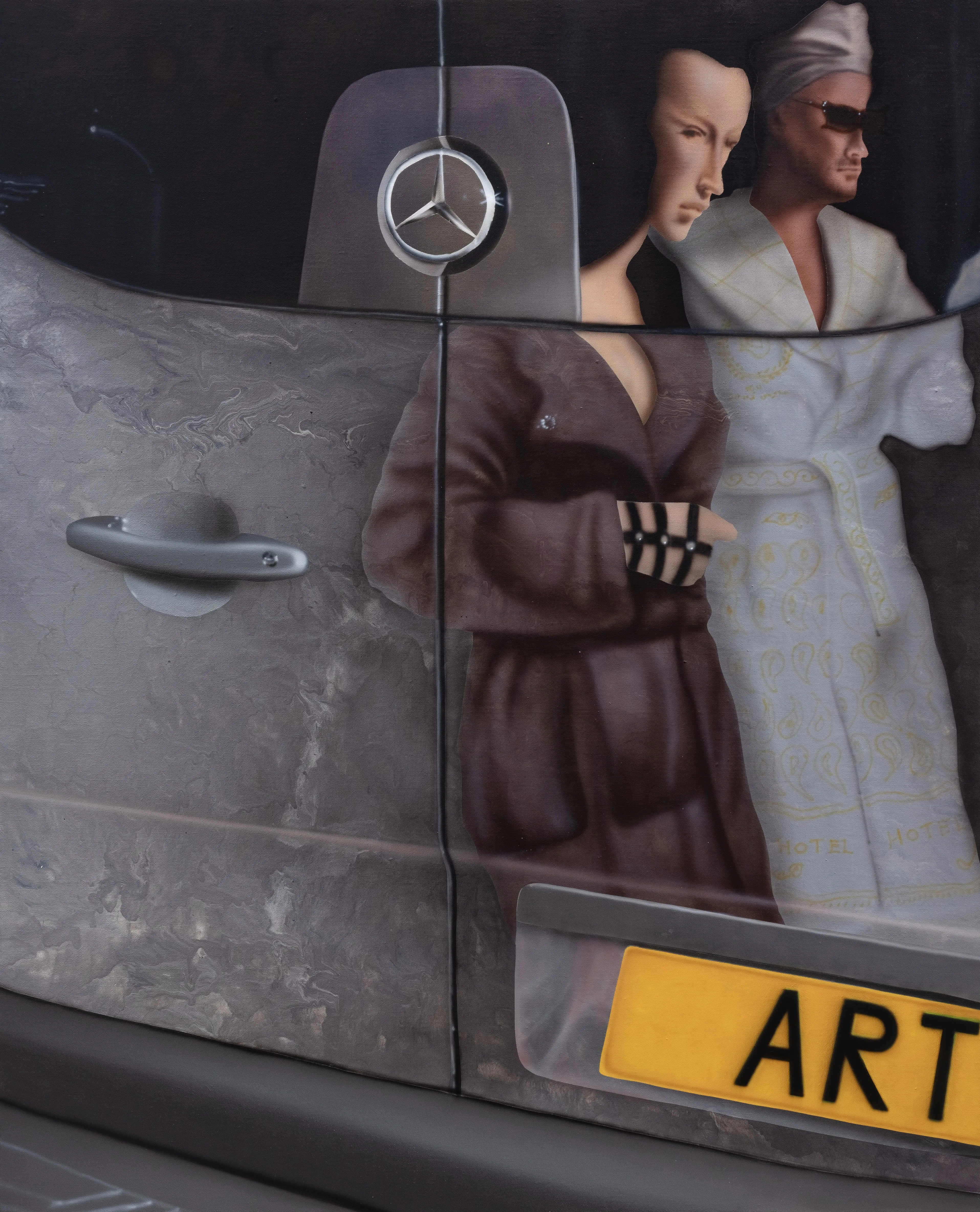 However, the various details Kang chooses to incorporate in his works may not be understood by everyone. Paintings such as Live Free or Die (2024) may leave audiences with more questions than answers: Why is the car plate “520 1314”, a known internet phrase meaning “I love you forever and always” in Chinese? Why is there a reflection of a woman putting on makeup in the rear mirror? Why is the mirror covered in gray?