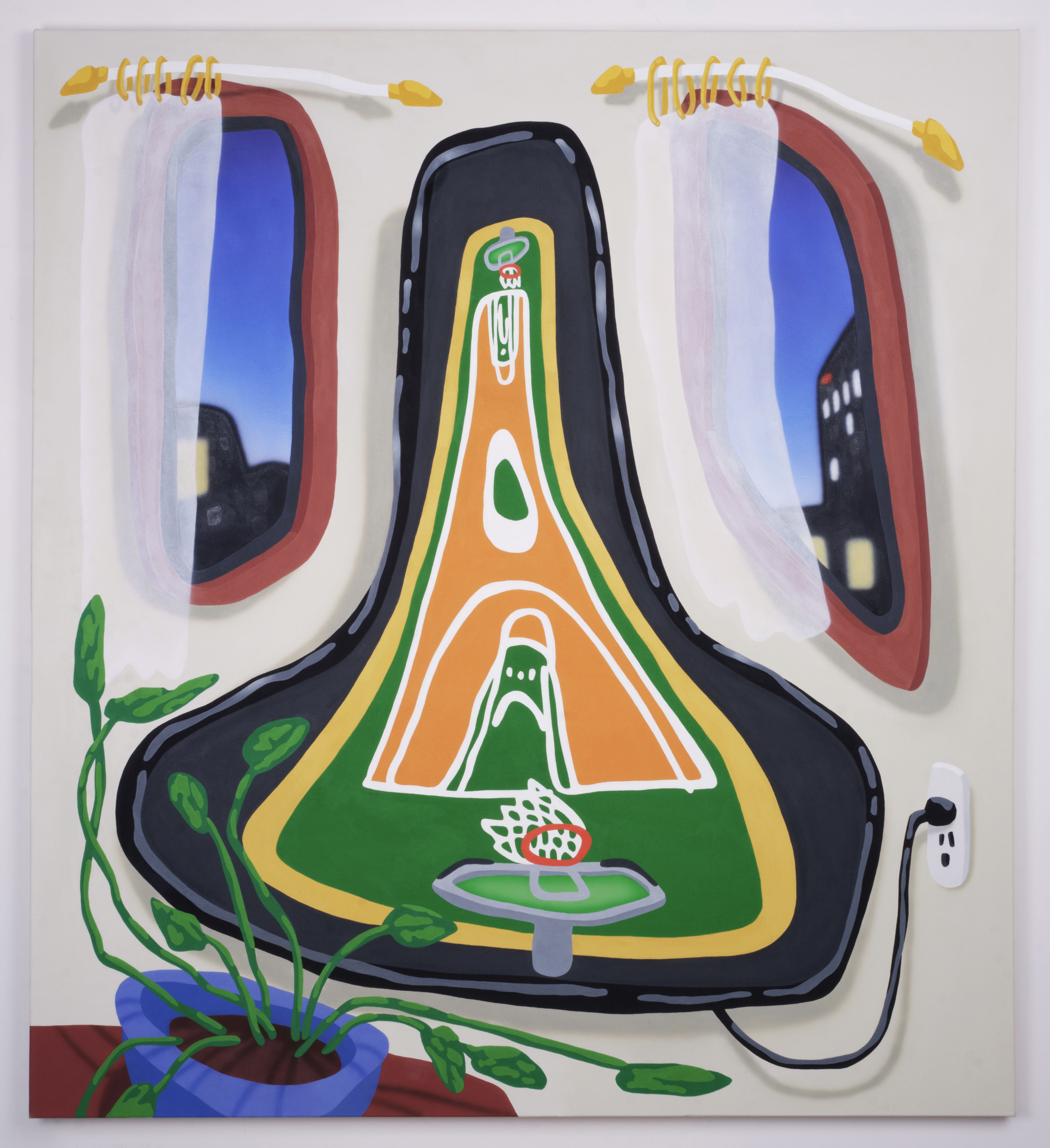 This REAL WORLD of Englander’s apartment in East Williamsburg spawns hallucinatory, anthropomorphic characters hidden in plain sight within the panoramic interior compositions. Windowed eyes peer down in California Dreaming and Swish II, tentacled rivulets spring through the showerhead in Hard Water, and a frowning basketball court flashes on screen for a moment in Swish II. These compressions and distortions “mimic our own various mental distortions – the way a memory can change in subtle ways every time you recall it or simply how your mood can influence the way you see”, explains the artist.[5]