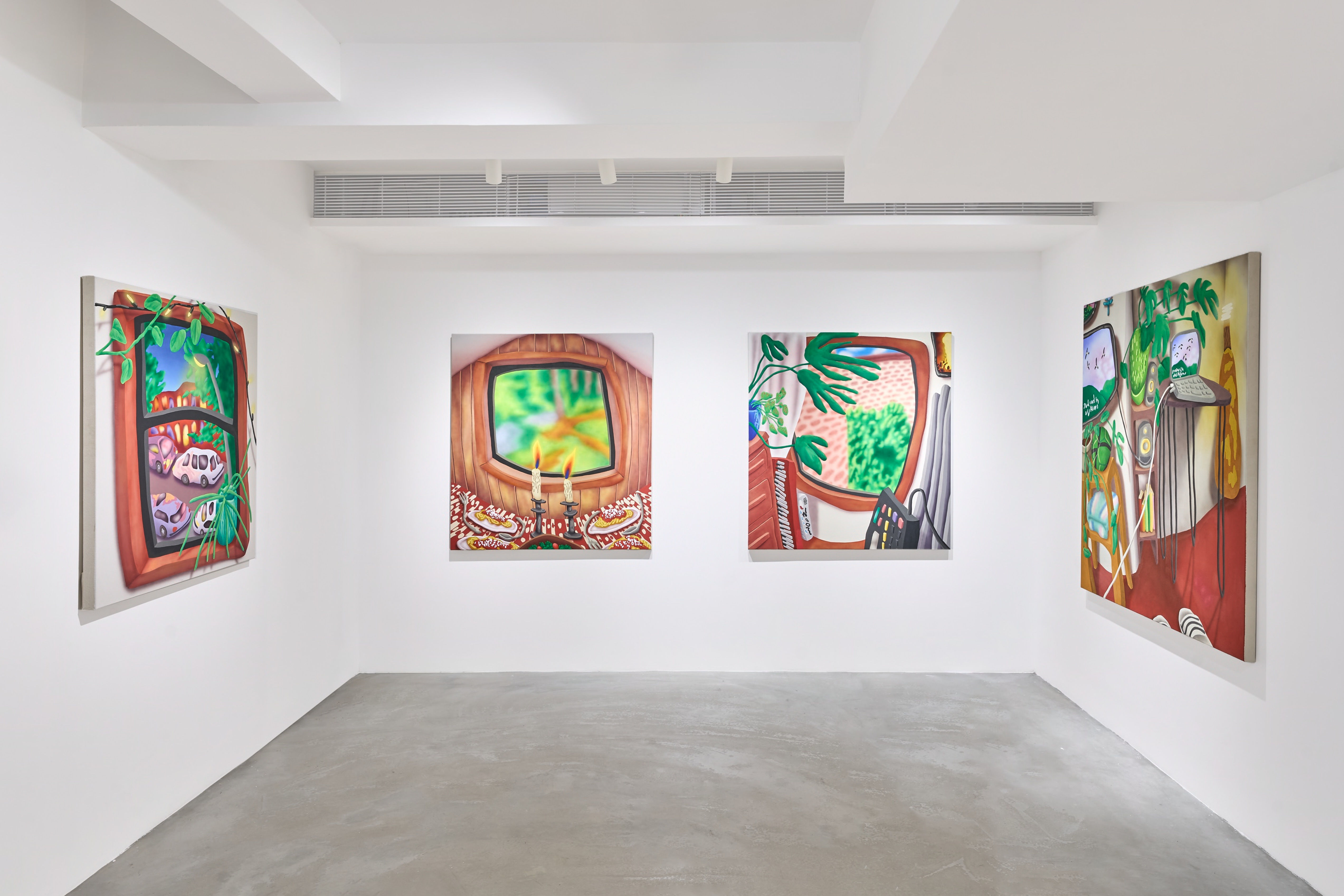 A lot of little elements have come together in the last four years to make this series. It started with the observational style, which was a way for me to connect with and make sense of my life; to just remember it even. The distorted perspectives were always there to some extent but I started leaning into them more as I went along and related to the feeling of fluidity. I also got an airbrush right before I started preparing this show and it gave me so many new ideas, such as bringing in the Impressionistic blurry backgrounds and doing more realistically rendered portions of the paintings. Exploring new tools is a really exciting part of making things for me.